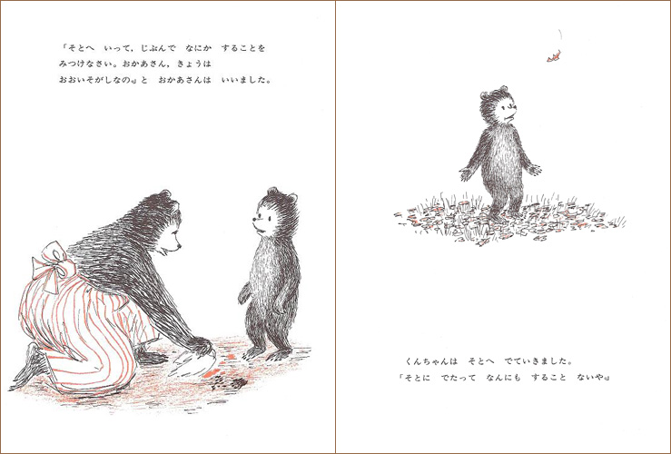 なにもすることがなくて、朝からたいくつなこぐまのくんちゃんはお母さんに何度もたずねます。「何をして遊んだらいい?」お母さんに言われるまま、ご飯をたべ、絵を描き・・・とうとうお母さんに自分でやることを見つけるよう言われたくんちゃんは、はじめはどうしたらよいか、分かりません。でも、家のまわりを歩いているうちに、川に木切れの船を浮かべ、石の家を作り、落葉の中でうさぎになり、くるみをひろい、シーツのテントで探検家に変身!!次々と遊びを見つけ、最後には家族の中で一番「おおいそがし」になりました。